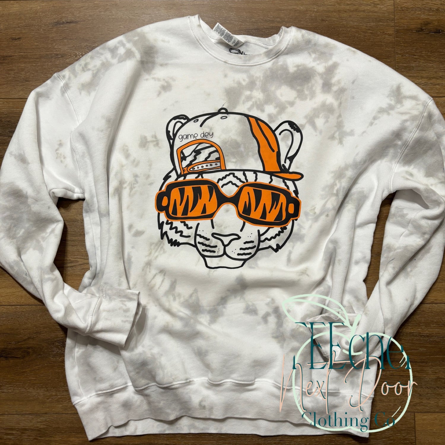 This is a sublimation design on white, bleached, and dyed items. Sublimation dyes the fabric and can have a vintage look when pressed. White does not show with sublimation-- the color of the shirt shows through the white areas of any design.